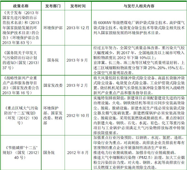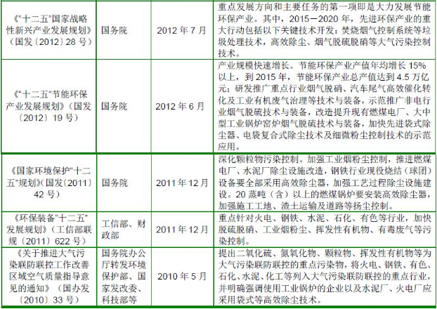 根據(jù)《國(guó)務(wù)院關(guān)于印發(fā)大氣污染防治行動(dòng)計(jì)劃的通知》(國(guó)發(fā)〔2013〕37號(hào))的要求,到2017 年,全國(guó)地級(jí)及以上城市可吸入顆粒物濃度比2012 年下降10%以上;京津冀、長(zhǎng)三角、珠三角等區(qū)域細(xì)顆粒物濃度分別下降25%、20%、15%左右;加快重點(diǎn)行業(yè)脫硫、脫硝、除塵改造工程建設(shè)。所有燃煤電廠、鋼鐵企業(yè)的燒結(jié)機(jī)和球團(tuán)生產(chǎn)設(shè)備、石油煉制企業(yè)的催化裂化裝置、有色金屬冶煉企業(yè)都要安裝脫硫設(shè)施,每小時(shí)20 蒸噸及以上的燃煤鍋爐要實(shí)施脫硫。除循環(huán)流化床鍋爐以外的燃煤機(jī)組均應(yīng)安裝脫硝設(shè)施,新型干法水泥窯要實(shí)施低氮燃燒技術(shù)改造并安裝脫硝設(shè)施。燃煤鍋爐和工業(yè)窯爐現(xiàn)有除塵設(shè)施要實(shí)施升級(jí)改造;京津冀、長(zhǎng)三角、珠三角等區(qū)域要于2015 年底前基本完成燃煤電廠、燃煤鍋爐和工業(yè)窯爐的污染治理設(shè)施建設(shè)與改造,完成石化企業(yè)有機(jī)廢氣綜合治理。